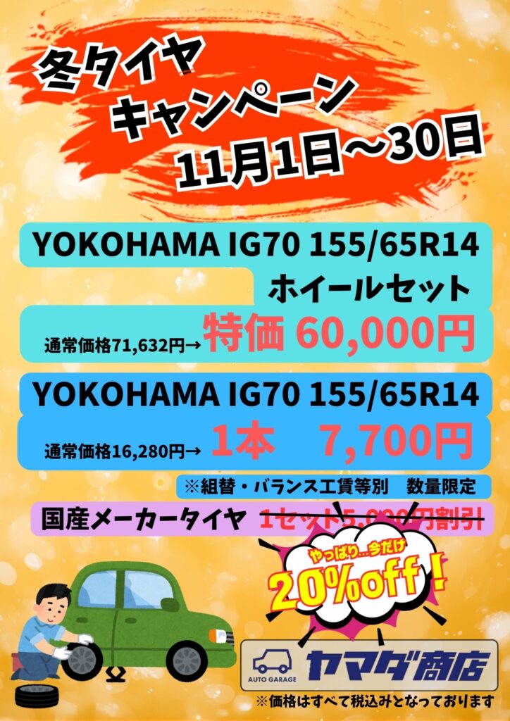 冬タイヤキャンペーン、間もなく終了! 2025年11月21日 「まだ大丈夫でしょ~」と思っている方ヤマダ商店で開催中の冬タイヤキャンペーンが今月末で終了します! POPに掲載されているタイヤメーカーだけではなく他社メーカーもお安く出来ますので 是非お問い合わせください(*’ω’*)