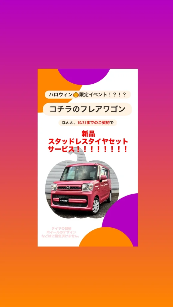 今日はキャンペーンのお知らせです! 10月31日までに コチラの【フレアワゴン】をご契約の方限定✨ 🎁なんと‼️ 【新品スタッドレスタイヤセット】をサービス‼️ 冬の準備がまだの方、今がチャンスです☃️ 気になる方はお早めにどうぞ〜‼️